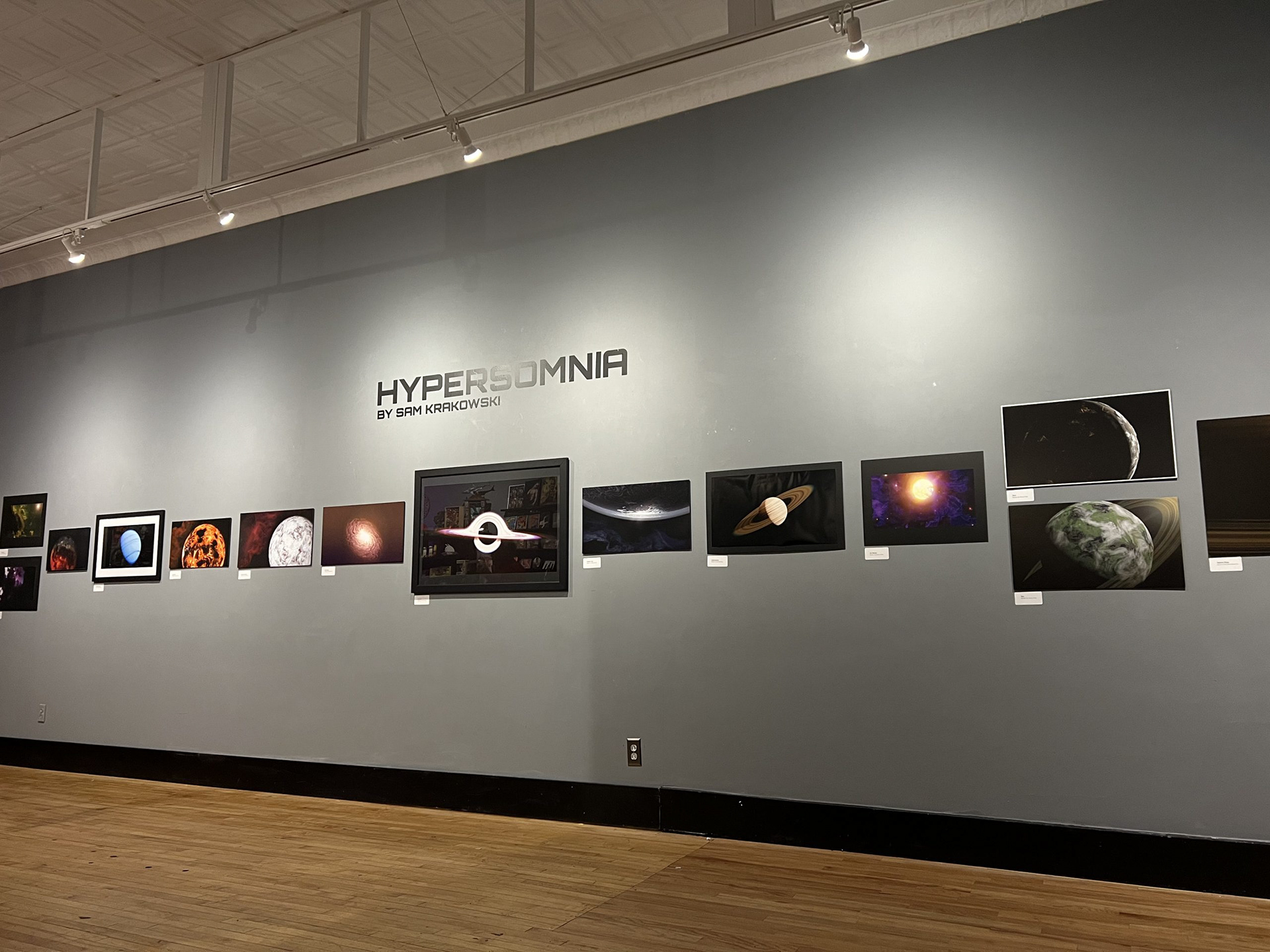 HYPERSOMNIA: Revolution Gallery, Buffalo NY, 2021. Escapism is a theory of mental diversion from ordinary daily life. I have always been fascinated and enthralled by space travel and our future as a species, for better or worse, since I was young. I grew up with a lot of anxiety, I saw the world around us and wondered if there was something better out there on a cosmic scale. Producing planets and nebulas became therapeutic for me, It allowed me to escape into otherworldly creations. Where I can control all the outcomes and variables. Image-making in Blender, a 3D rendering program, allowed me the versatility to create my vision of escapism.